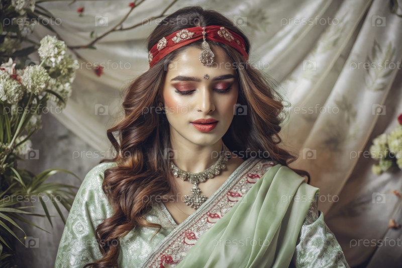 Женщина в светло-зеленом сари и элегантных аксессуарах на культурном празднике