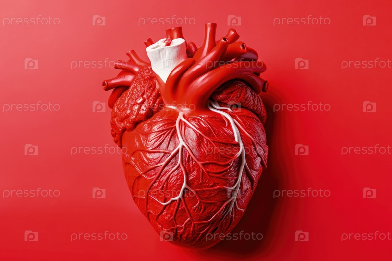 Красная анатомическая модель сердца на ярко-красном фоне