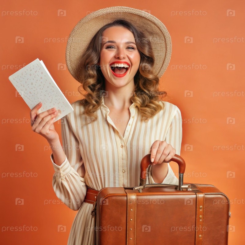 Счастливая женщина с дорожным чемоданом и блокнотом на красочном фоне