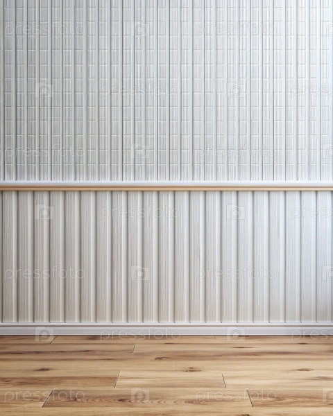 Простая стена из белых плиток с деревянным полом в просторном интерьере