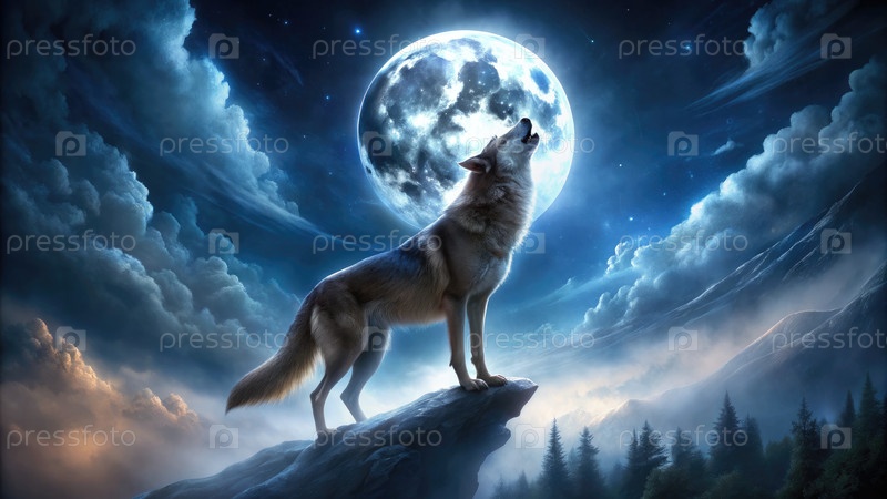 Волк выет на полную луну под звездным ночным небом в темном лесу