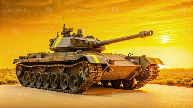 Танк, расположенный на фоне заката солнца в пустынном пейзаже