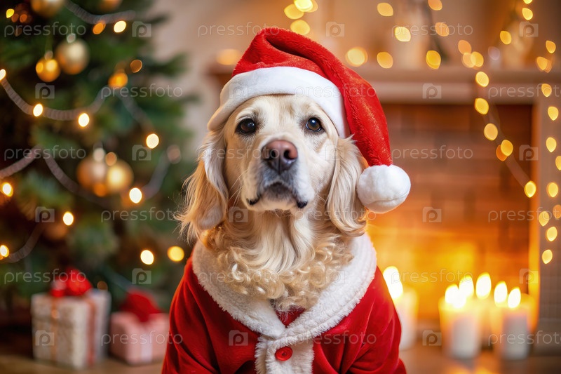 Собака Санта в праздничном наряде у уютного камина во время отпуска