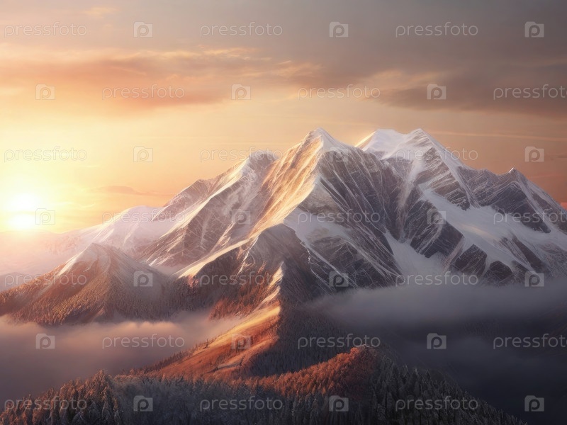 Потрясающий закат солнца над величественными горами с облаками и яркими цветами