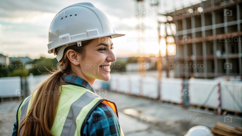 Улыбающаяся молодая женщина-строительница на стройплощадке во время заката