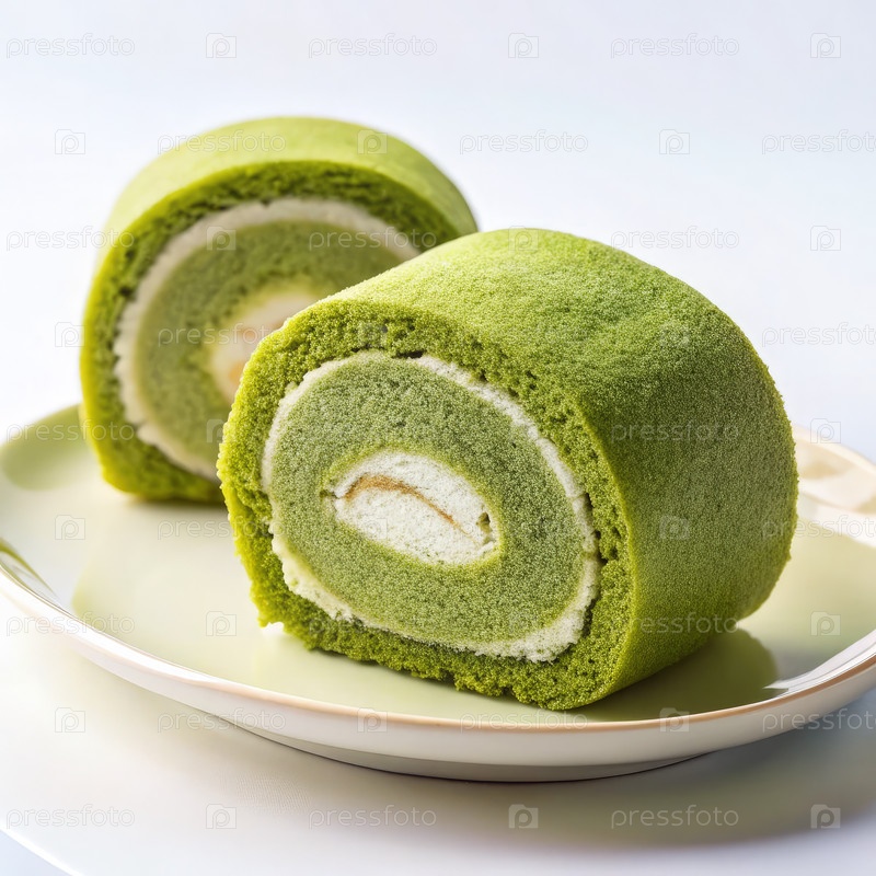 Вкусный торт с роллом зеленого чая мача, подаваемый на белой тарелке для наслаждения в любое время