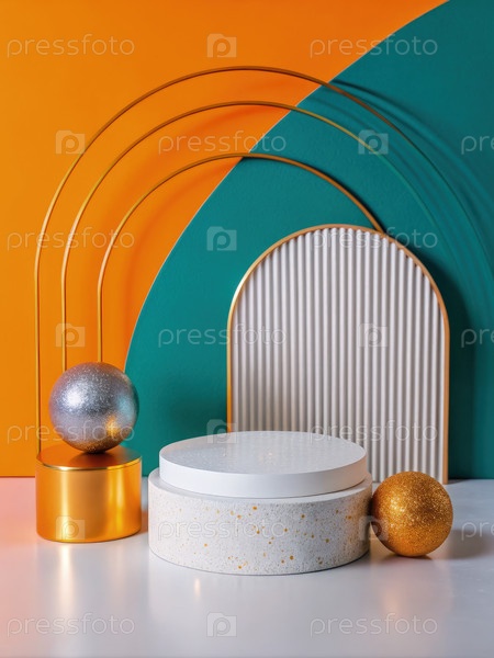 Стильный продуктовый подиум с золотой кривой и декоративными сферами