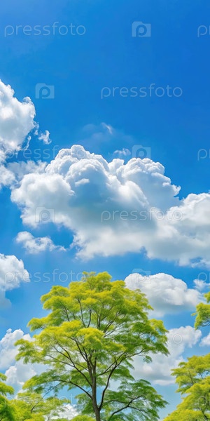 Ярко-синее небо с пушистыми белыми облаками над яркими вершинами деревьев в дневное время