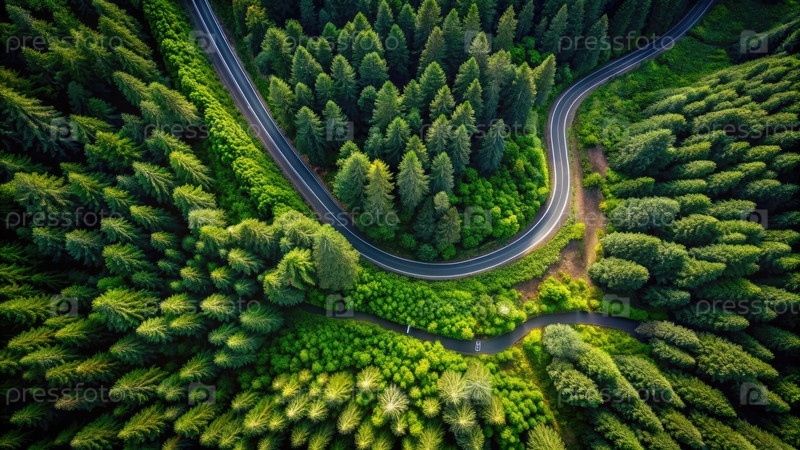 Вид с воздуха извилистой горной дороги через густый зеленый лес