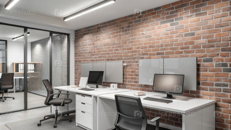 Современное офисное рабочее пространство с аккуратным освещением и дизайном кирпичных стен