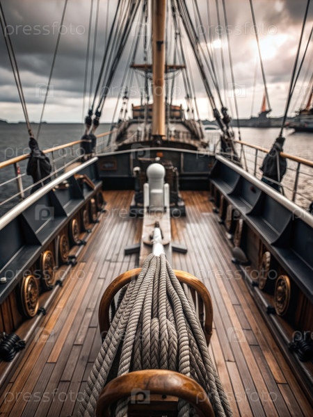 Вид на палубу корабля с деревянными веревками под облачным небом в море