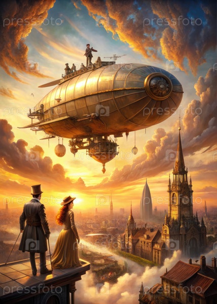 Степанковый дирижабль, летящий над оживленным городом на закате