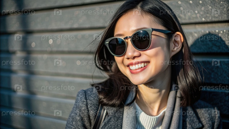 Счастливая молодая японская женщина в солнцезащитных очках наслаждается солнечным днем на свежем воздухе