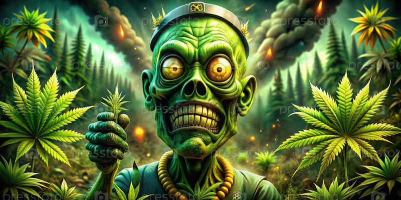 Золотой зомби держит растение каннабиса в драматическом лесном ландшафте