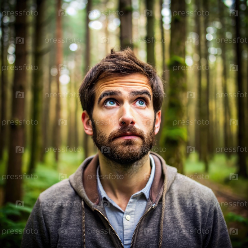 Человек, смотрящий вверх с неопределенностью в тихой лесной обстановке