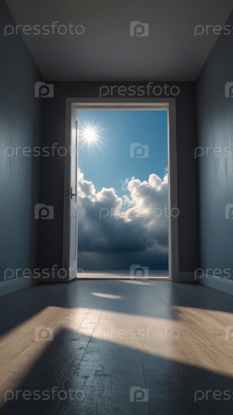Солнечный свет течет через открытую дверь в серой пустой комнате