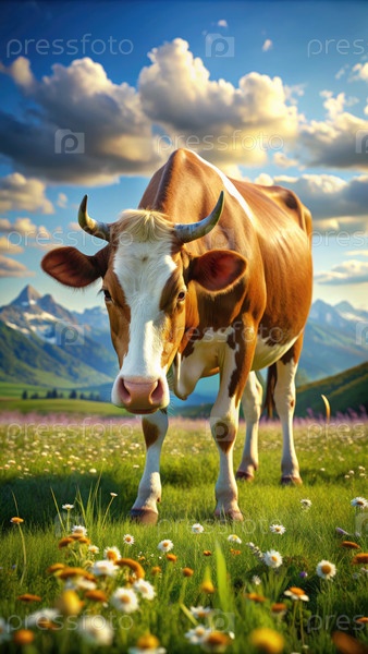 Корова, мирно пасущаяся на живописной лужайке под солнечным небом