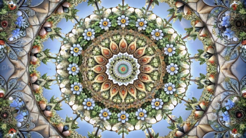 Сложный дизайн цветочной мандалы с натуральными элементами и яркими цветами