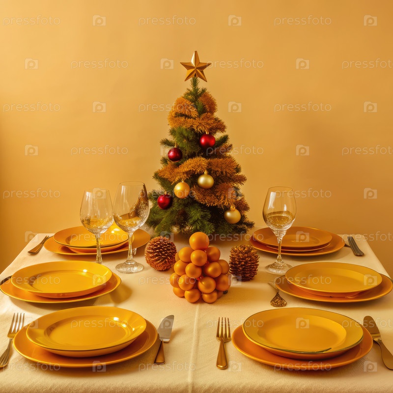 Элегантный рождественский обеденный стол с декоративной елкой и золотыми акцентами