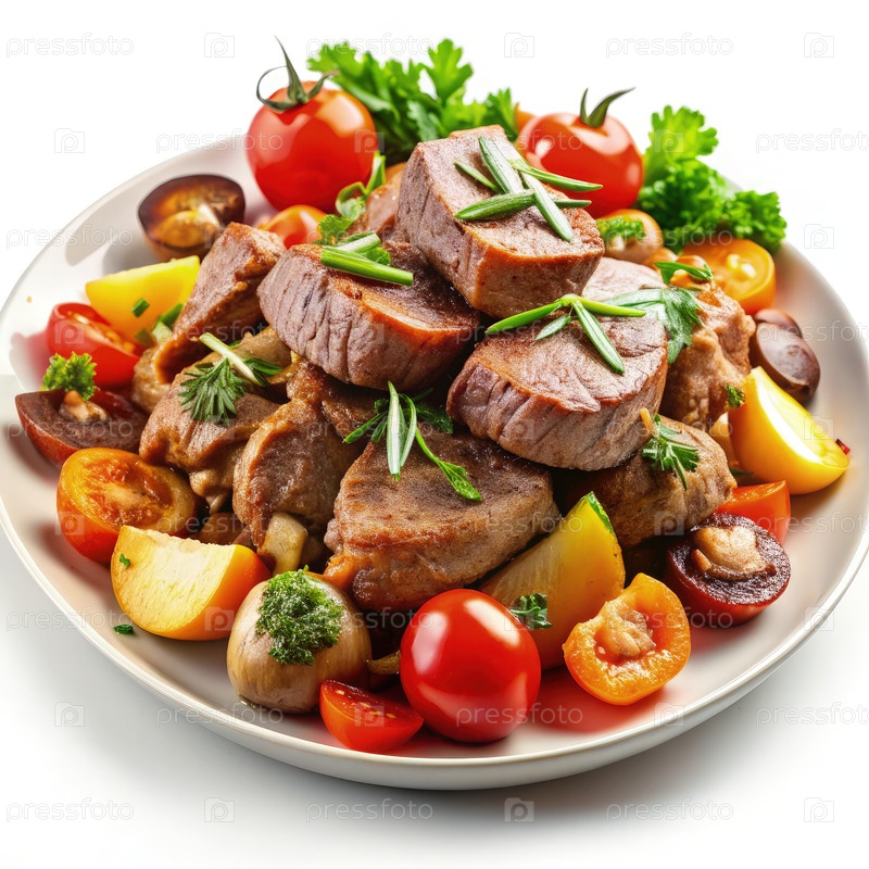 Сладкое мясо с грибами и свежими овощами на белой тарелке