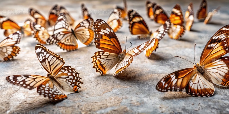 Коричневые и белые бабочки, отдыхающие на серой поверхности в естественной среде обитания