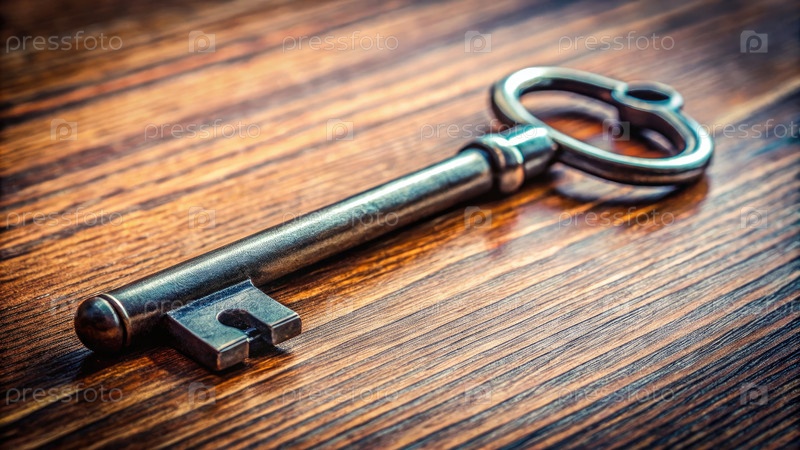 Современный железный ключ, опирающийся на стандартную шкалу на деревянной столовой поверхности