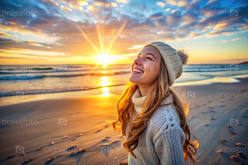 Веселая девушка наслаждается потрясающим восходом солнца на пляже на рассвете