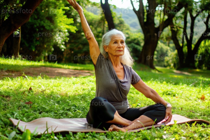 Пожилая женщина практикует йогу на открытом воздухе в спокойной обстановке парка