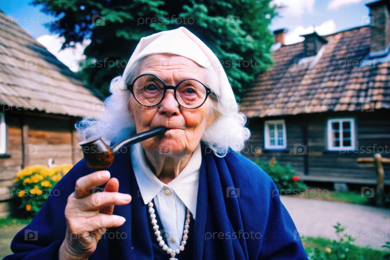Пожилая женщина в очках наслаждается трубой за пределами традиционных деревянных домов