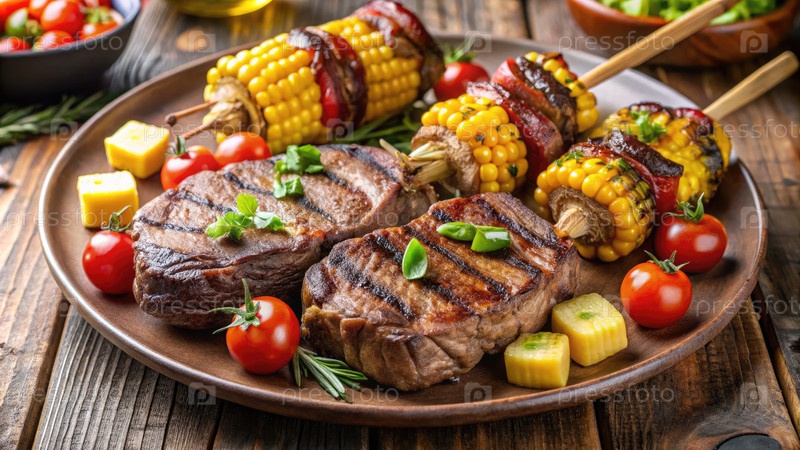 Вкусные стейки с ребрами BBQ, подаваемые с кукурузой и овощными кабобами на деревенском столе