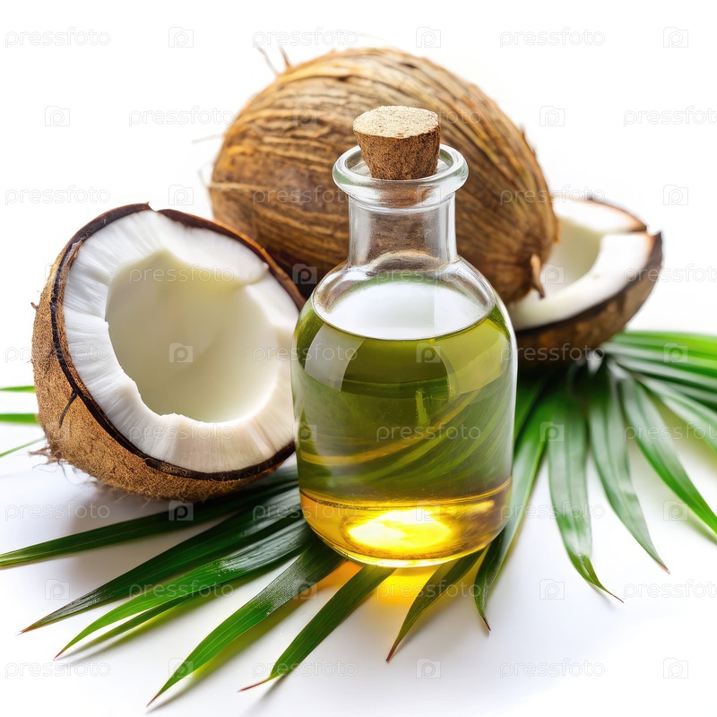 Бутылка кокосового масла со свежими кокосами и пальмовыми листьями в селективном фокусе
