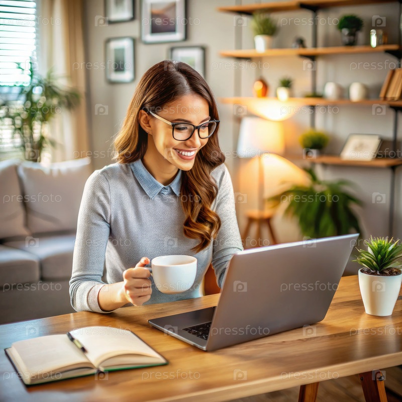 Женщина, работающая из дома за столом с ноутбуком, чашечкой кофе и блокнотом
