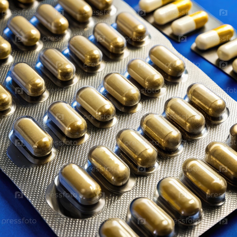 Различные полоски таблеток, изолированные по стандартной шкале на синем фоне
