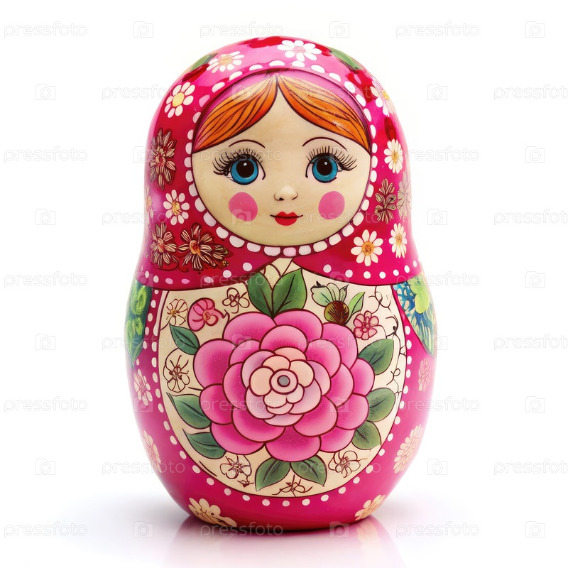 Красиво выполненная кукла матриошка имеет яркие розовые узоры и сложные цветочные рисунки