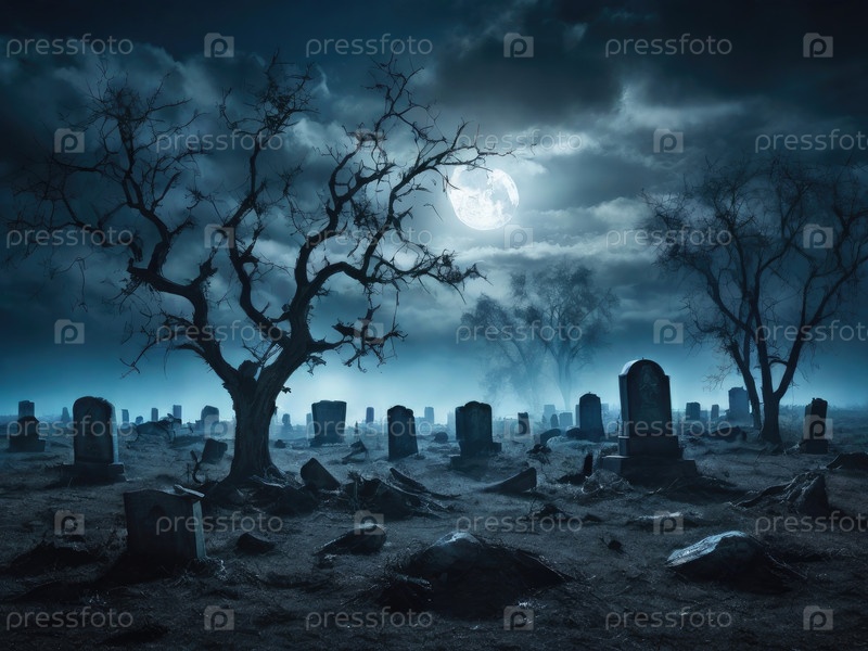 Страшное кладбище под полнолунием ночью с извращенными деревьями и тенями