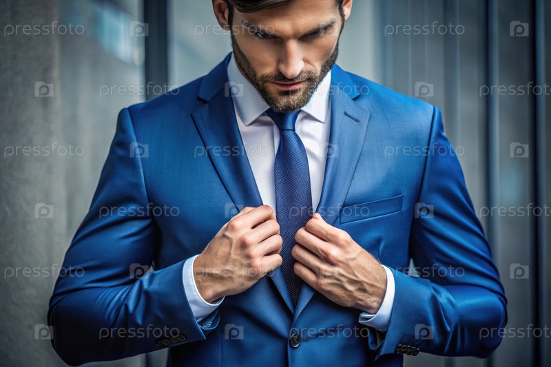 Мужчина в ярко-синем костюме настраивает куртку в современной городской обстановке