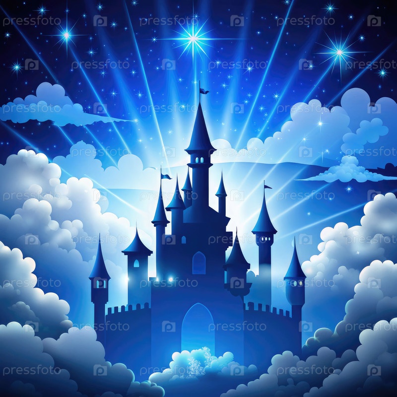 Величественный синий замок, возвышающийся над облаками под звездным ночным небом