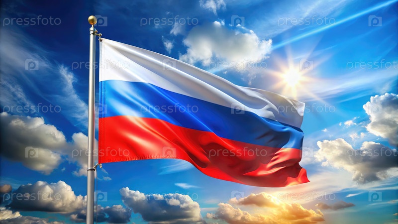 Машущий российский флаг светит под ярким небом в солнечный полдень