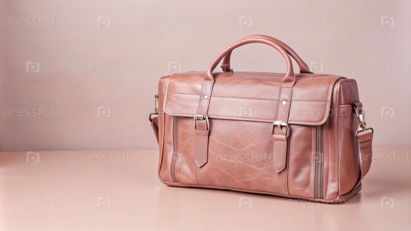 Кожаная мужская сумка на деревянном столе с мягким фоном