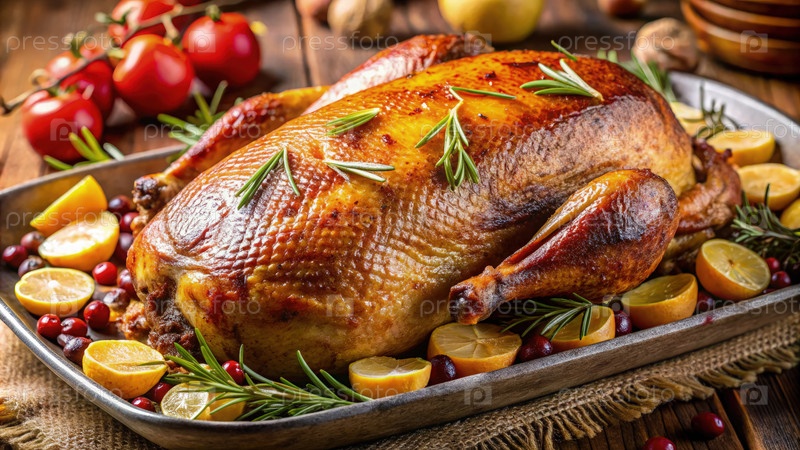 Вкусно обжаренная утка, украшенная травами и цитрусовыми на деревянном столе