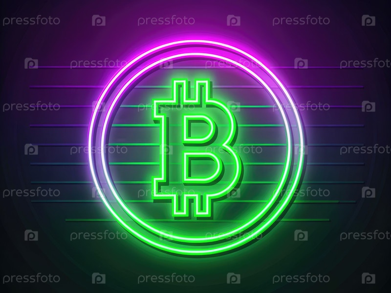 Неоновая линия изображения Биткойн символ светит в зеленых и фиолетовых тонах на темном фоне