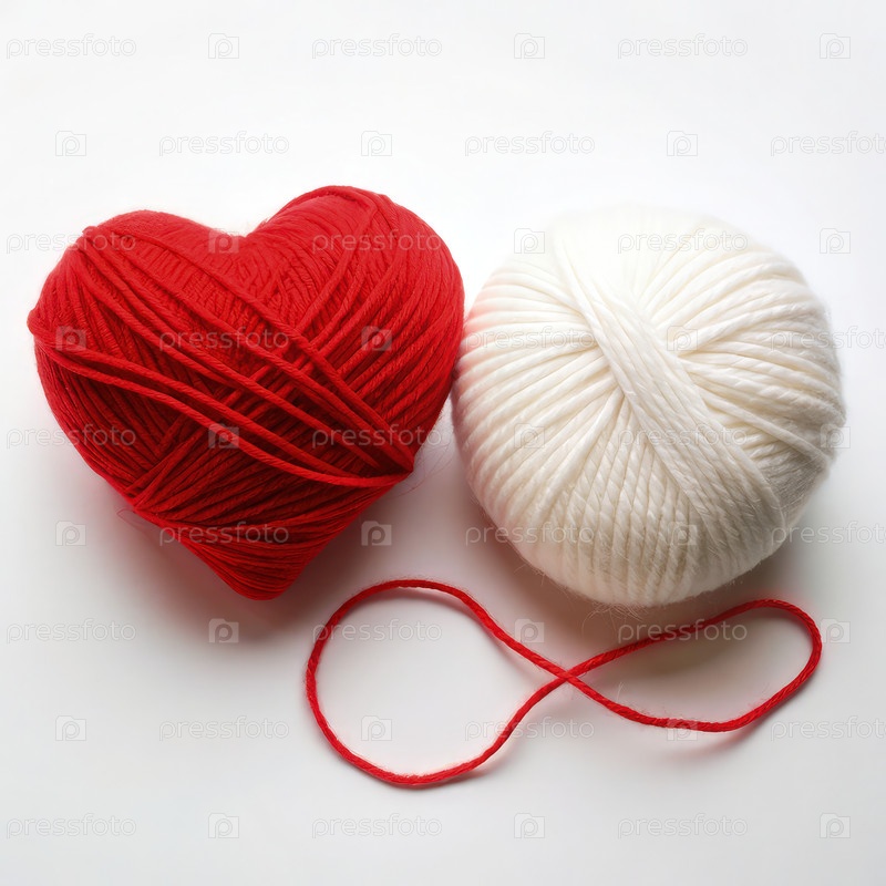 Красная пряжа в форме сердца и шарик белой пряжи на ярком фоне