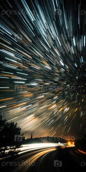 Звездные тропы создают динамическое ночное небо над тихим пейзажем на закате