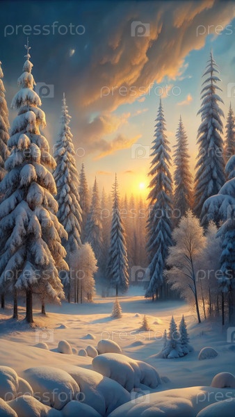 Спокойный закат солнца бросает золотые оттенки над снежным лесным пейзажем