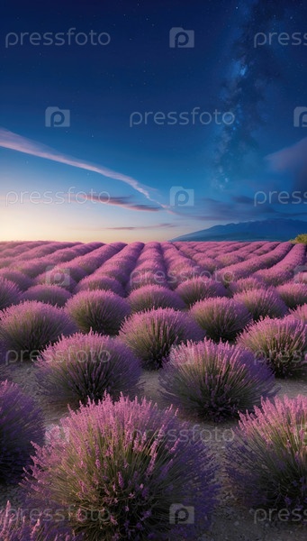 Поле лаванды на закате с ярко-фиолетовыми цветами под красочным небом