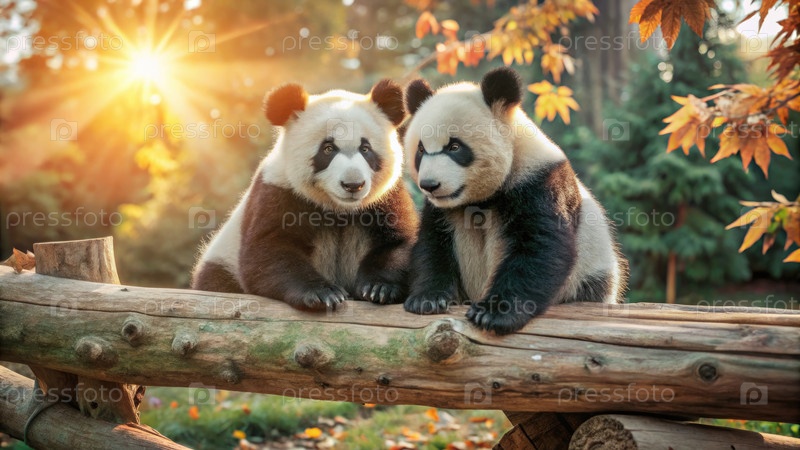 Две игривые панды на бревне под теплым закатом солнца с осенними листьями вокруг них