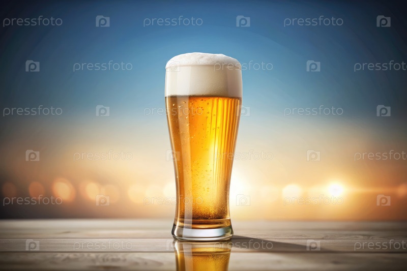 Векторная графика стандартного бокала пива с пеной на фоне заката солнца