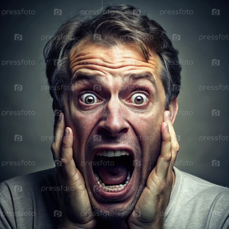 Человек, выражающий экстремальный страх в то время как он держит свое лицо дома при слабом освещении