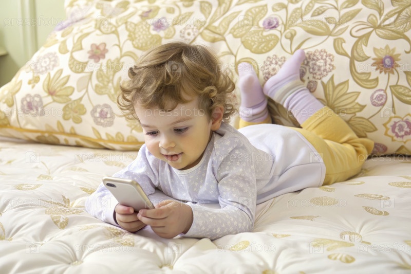 Милый ребенок лежит на цветочном одеяле, счастливо пользуясь телефоном днем