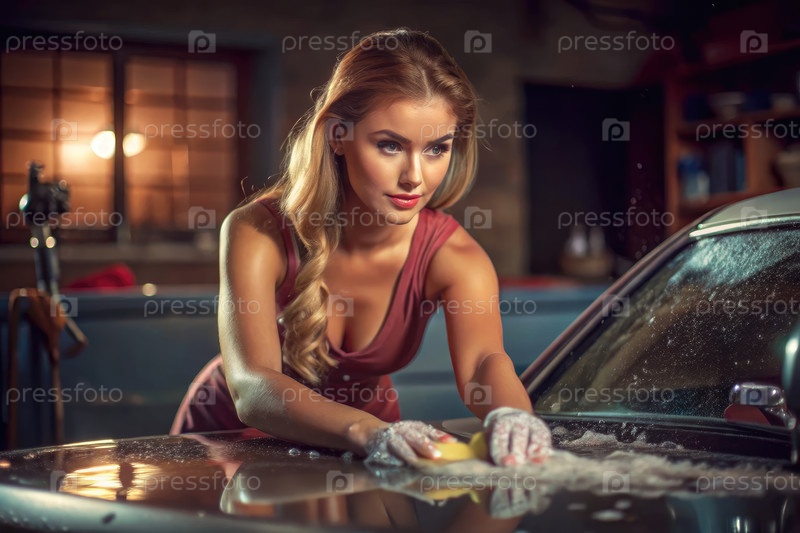 Высококачественная реставрация женщины, моющей классический автомобиль в гараже ночью